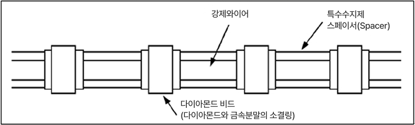- 다이아몬드가 소결된 금속 비드와 이를 연결하는 강철 케이블로 구성됩니다. 비드의 직경은 일반적으로 10~20mm이며, 1m당 40~50개의 비드가 일정한 간격으로 배치됩니다.