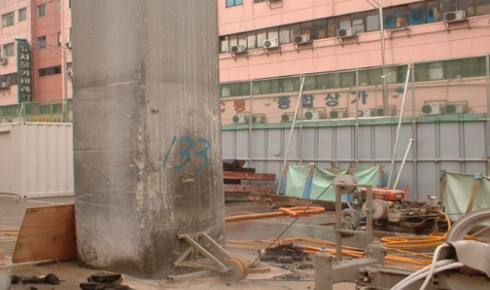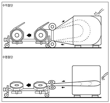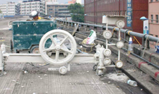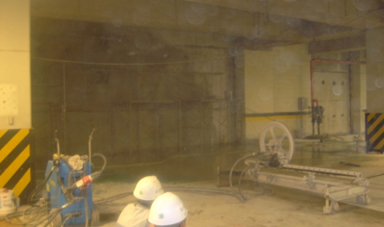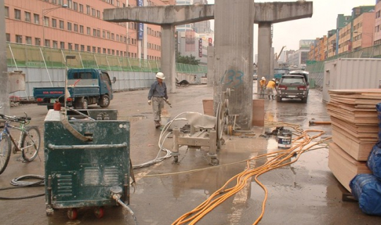 - 계단, 엘리베이터, 채광창 등을 신설할 때 바닥면 절단이 필요합니다. 절단 방식은 벽면 절단과 동일하나, 와이어 방향이 상향이기 때문에 냉각수 공급이 어려울 수 있으며, 이에 대한 대비가 필요합니다.