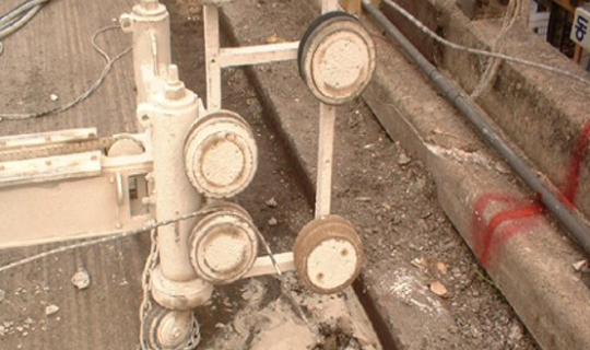 - 다리, 굴뚝, 대형 파이프 등 대규모 구조물 철거 시 주로 적용되는 절단 방식입니다. 가장 간단한 방법은 구조물에 다이아몬드 와이어를 원형으로 걸친 후, 장비를 후진시켜 와이어의 장력을 유지하면서 절단하는 방식입니다. 그러나 대부분의 경우 여러 개의 중동 휠(Idler Wheel)을 다양한 위치에 복합적으로 배치하여 와이어의 절단 방향을 조정합니다. 또한 절단 크기를 줄이기 위해 별도의 천공을 통해 부분 절단을 병행하기도 합니다. 최대 절단 면적은 기계의 출력과 와이어 길이에 따라 결정되며, 와이어 수명이 다하기 전 절단이 끝날 수 있도록 충분한 길이를 확보하는 것이 바람직합니다.