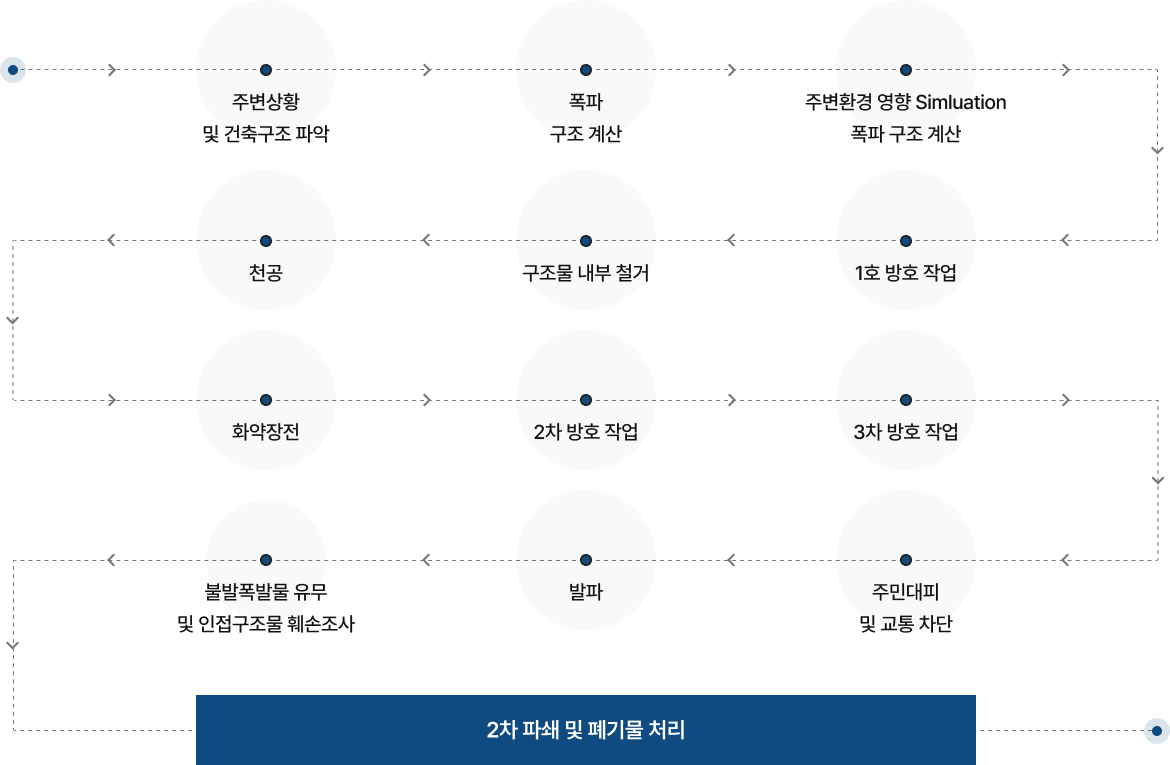 적정량의 폭약을 장전하고 뇌관을 활용해 시차를 두고 순차적으로 폭발시키는 방식입니다.